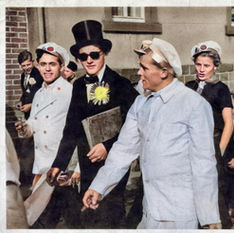 Links Kerweredner Winfried Wingert vor einem "Unterseeboot", 1959 im Hof von Karl Glück.
